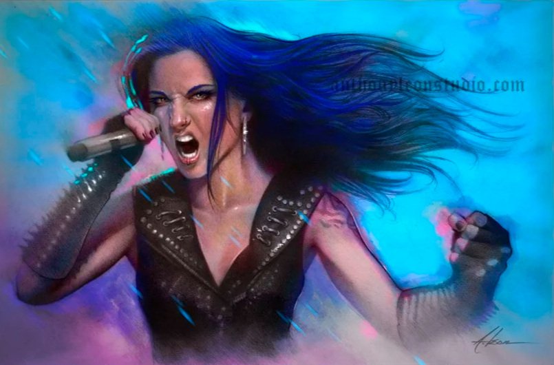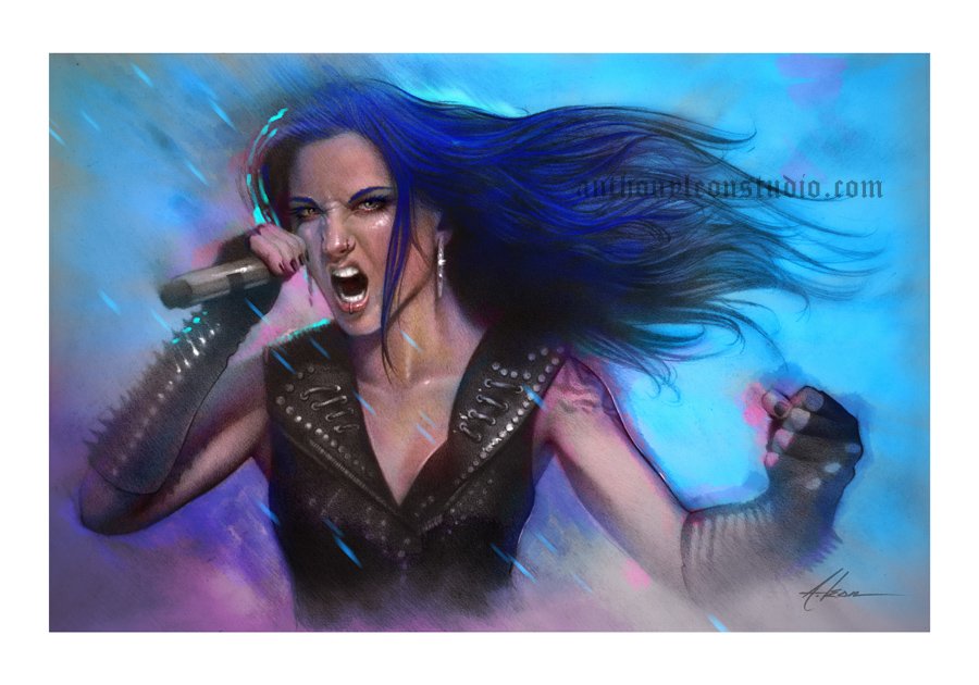 Alissa is the singer for the band Arch Enemy. She has a nice natural singing voice but most of her singing in the band is a growling rough style that figures into the bands sound. I prefer her natural voice. This one is graphite on Arches hot press watercolor paper with color over the top. Art is 12x18 inches. 30x45 cm. More insight into this piece can be found in my Thoughts section.