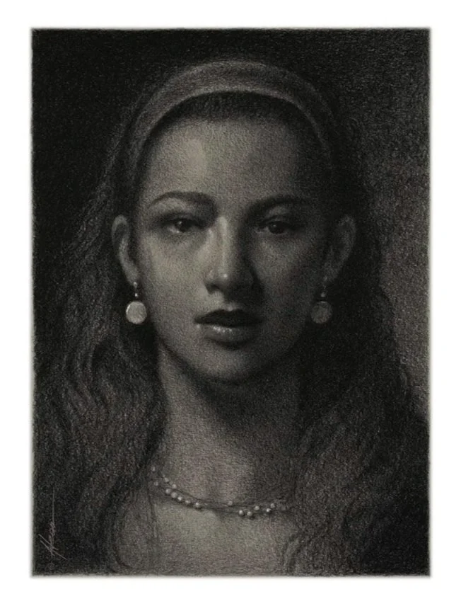Master copy of a Charles Weed painting titled Girl With Gold Earrings. Graphite on Crane cotton paper. This one is 8x10 inches. 20x27.5 cm.