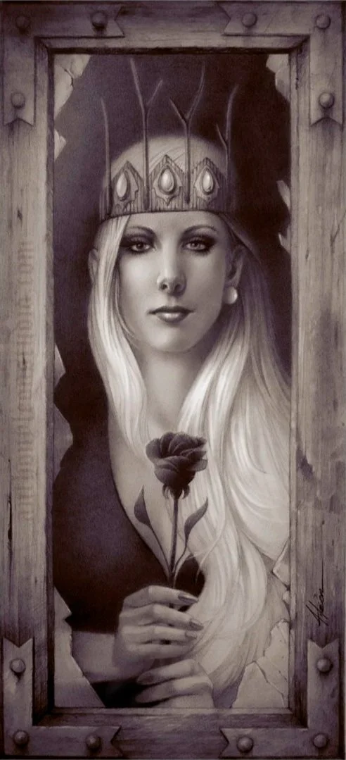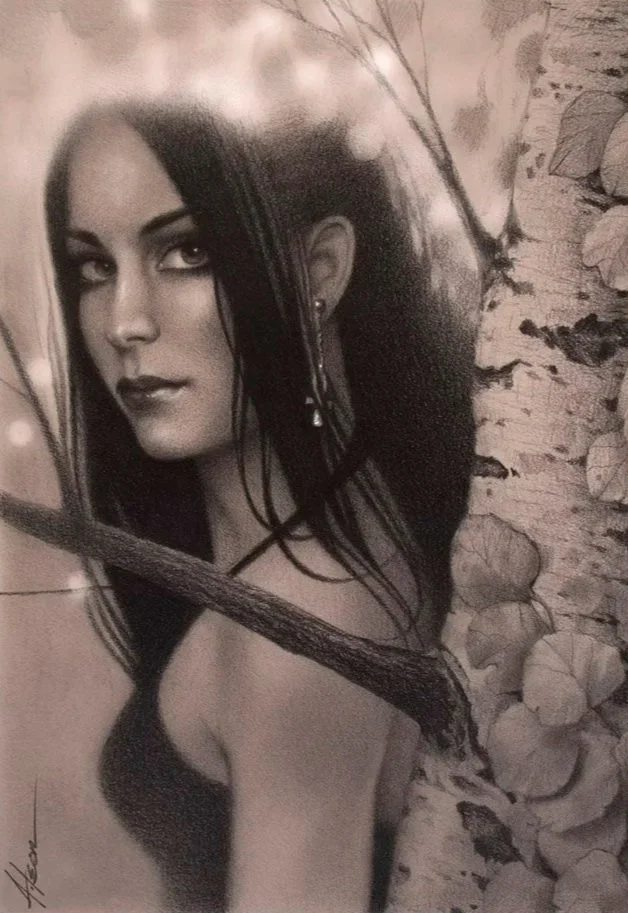 Aleah was the singer and one of the songwriters for the band Trees Of Eternity. I worked with the music themes and their name to place her in a forest. I wanted it to have a quiet walking through the trees setting with the glow she radiated. Art is graphite and pastel on Strathmore 400 series paper. Art is 7x10 inches. 17.5x25 cm.