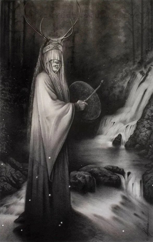 I based this piece on Maria Franz of the band Heilung. I wanted to use their themes and music to set up a mystical forest setting. This relates to their music and atmosphere. Pastel and graphite on Stonehenge paper. Art is 16x24 inches. 40.5 x 61 cm.